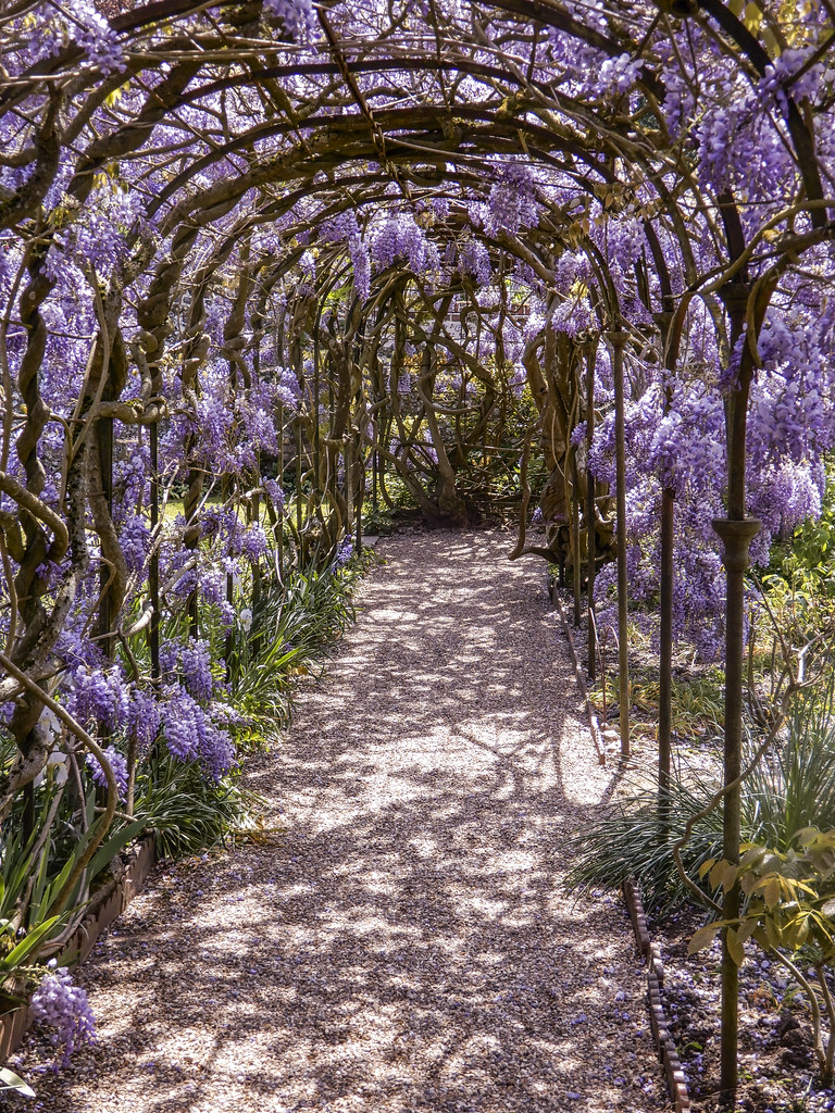 Wisteria brings an ethereal vibe with its cascading lilac blooms.