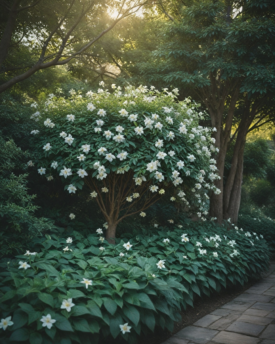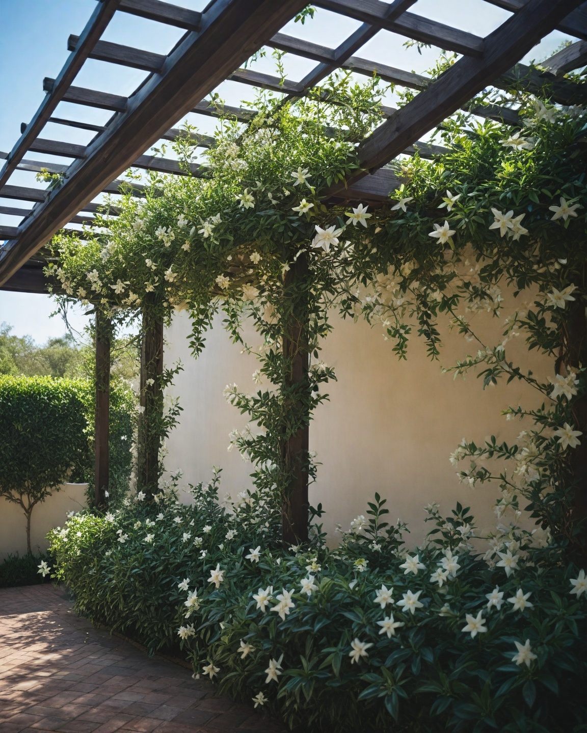 Star Jasmine thrives in the shade and produces clusters of starry white flowers.