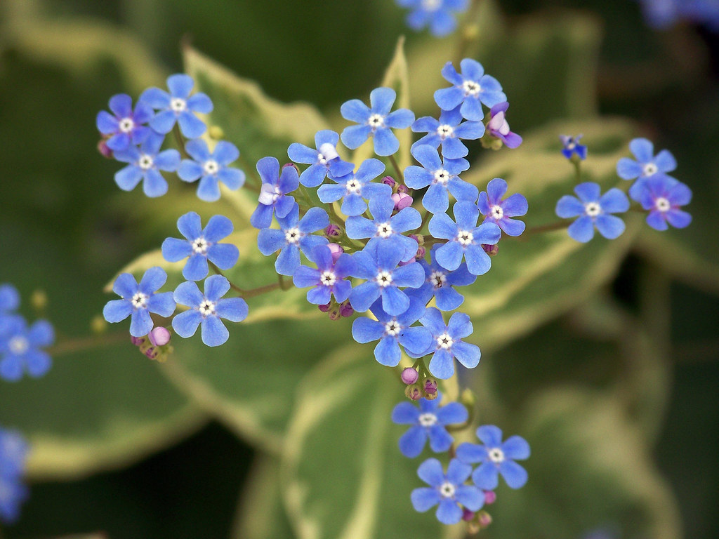 In early spring, clouds of tiny blue flowers float above the foliage, looking like forget-me-nots. The silvery-green leaves maintain interest all season long. Several varieties offer different leaf patterns – ‘Jack Frost’ has silver leaves with green veins, while ‘Sea Heart’ sports extra-wide silver leaves.