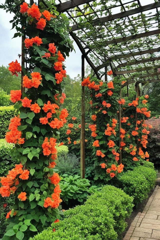 Trumpet Vine races up trellises and attracts hummingbirds with its vibrant, trumpet-shaped flowers.
