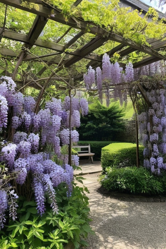 Wisteria loves the warmth of Zone 9 and offers cascading purple flowers that look straight out of a fairy tale.