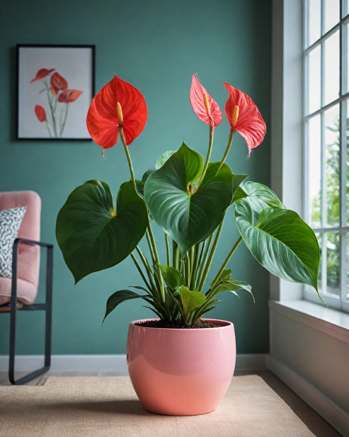 Anthuriums are great for living rooms because they bloom with bright red flowers pretty much all year round.
