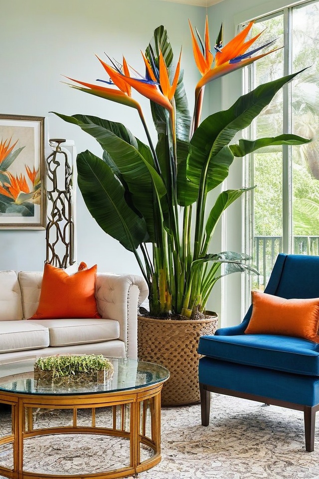 Birds of Paradise bring a touch of the tropics inside your home with their striking orange and blue flowers.