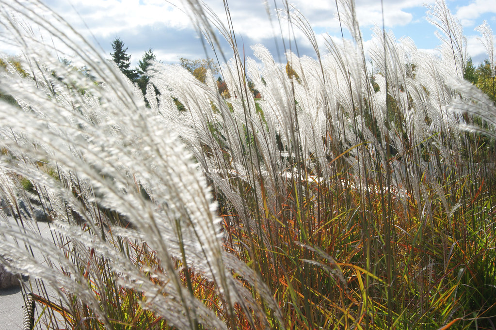The grass changes appearance seasonally, starting with green blades in spring, developing silvery-white plumes in late summer, and turning golden-bronze in fall, persisting through winter.