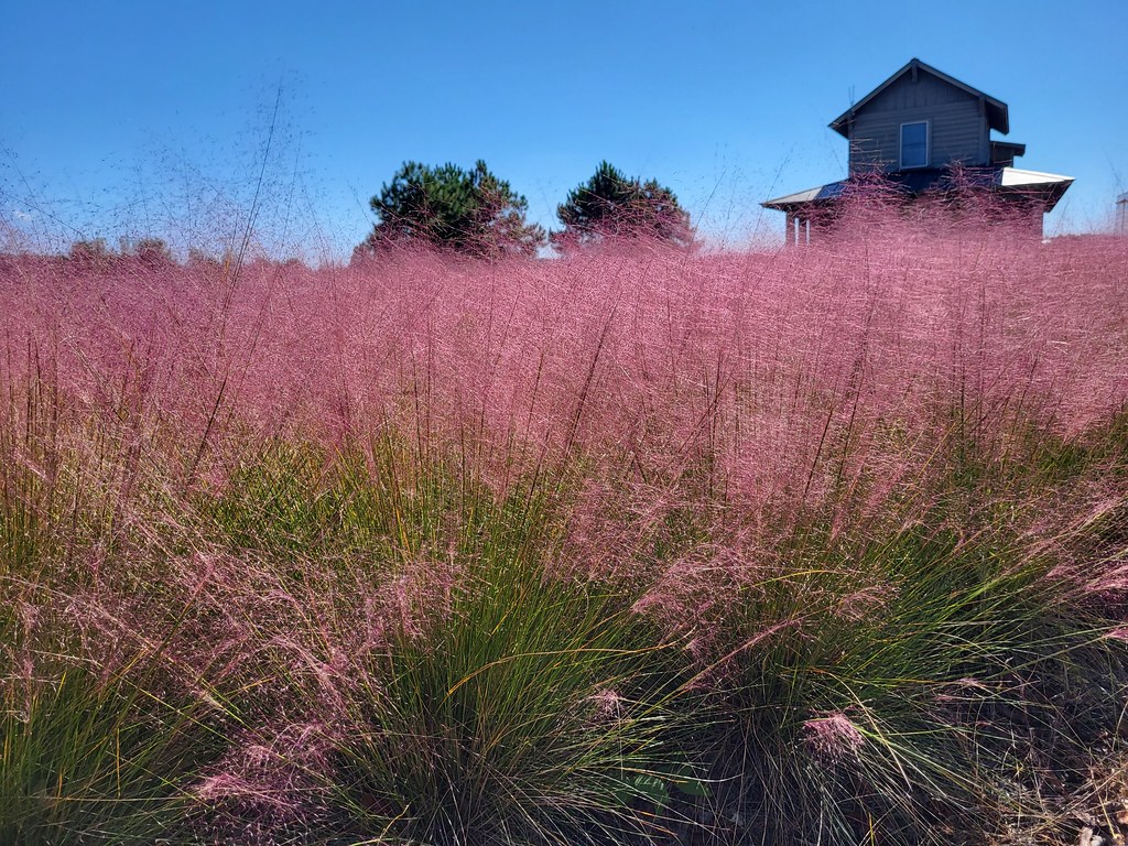 The grass maintains a green to blue-green color throughout spring and summer, then produces distinctive pink to purple plume-like flowers in late summer and fall, creating a hazy, cloud-like effect.