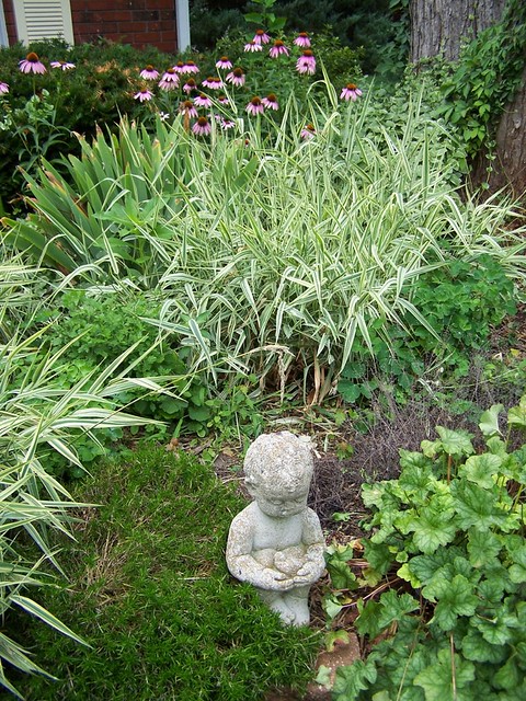 Its distinctive striped leaves display green and white variegation throughout the growing season, with some cultivars showing pink tinges.