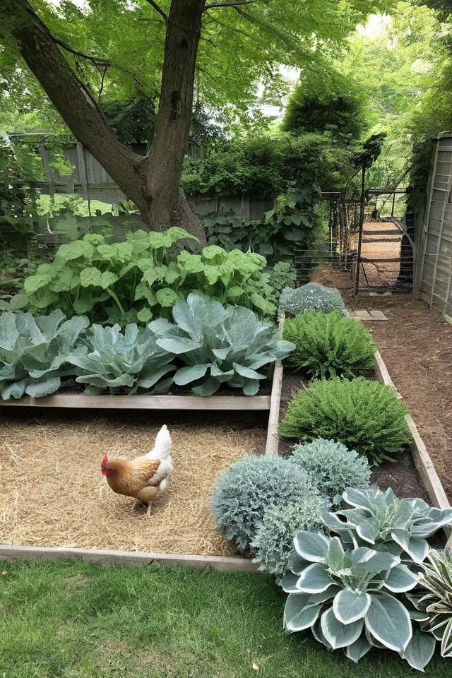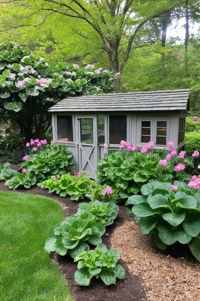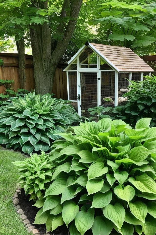 Hostas are perfect for shady spots and chickens love lounging under their big, leafy foliage.