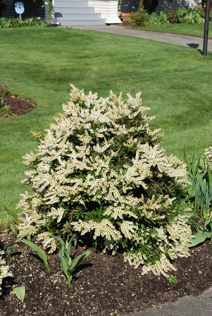 Japanese Pieris is a great pick for shady areas with its pretty white flowers and evergreen foliage.