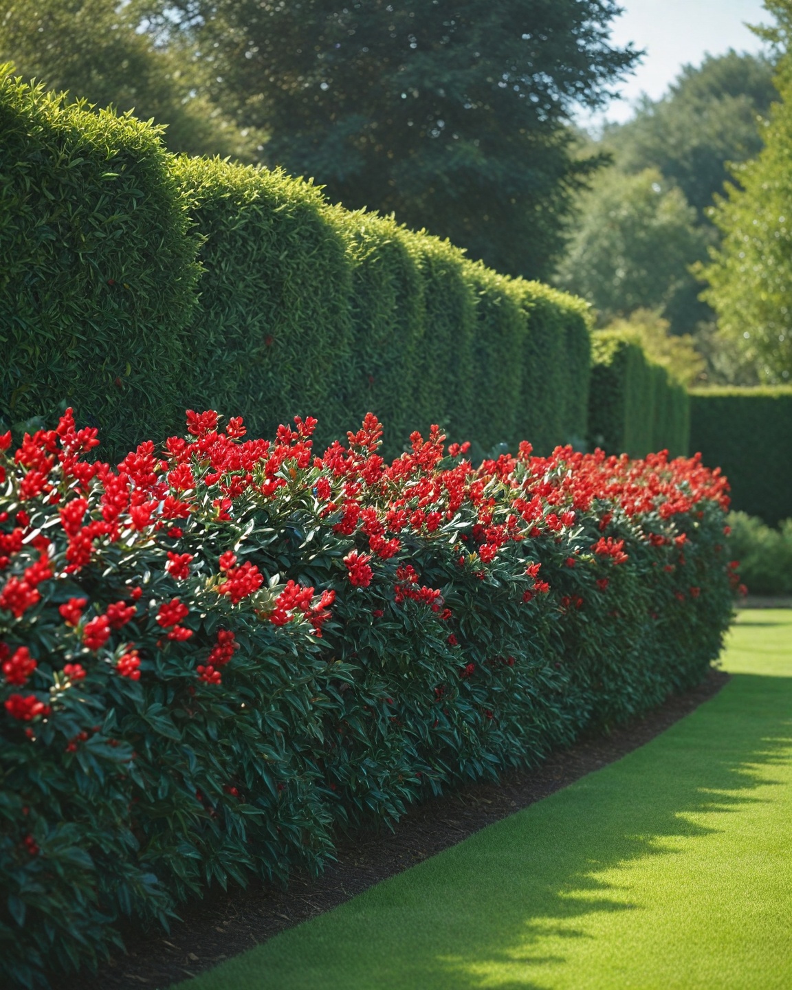 Holly bushes make for striking hedges with their glossy leaves and bright red berries.