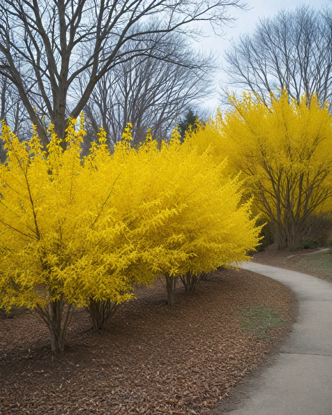 Forsythia blooms early in the spring with bright yellow flowers, giving a much-needed color boost after winter.