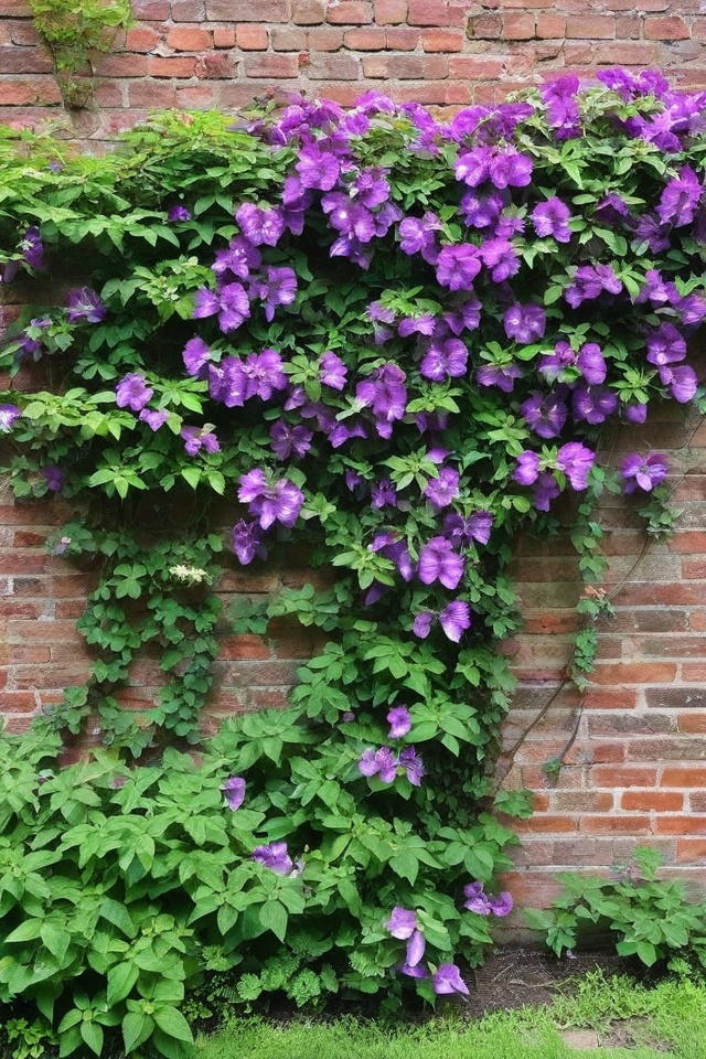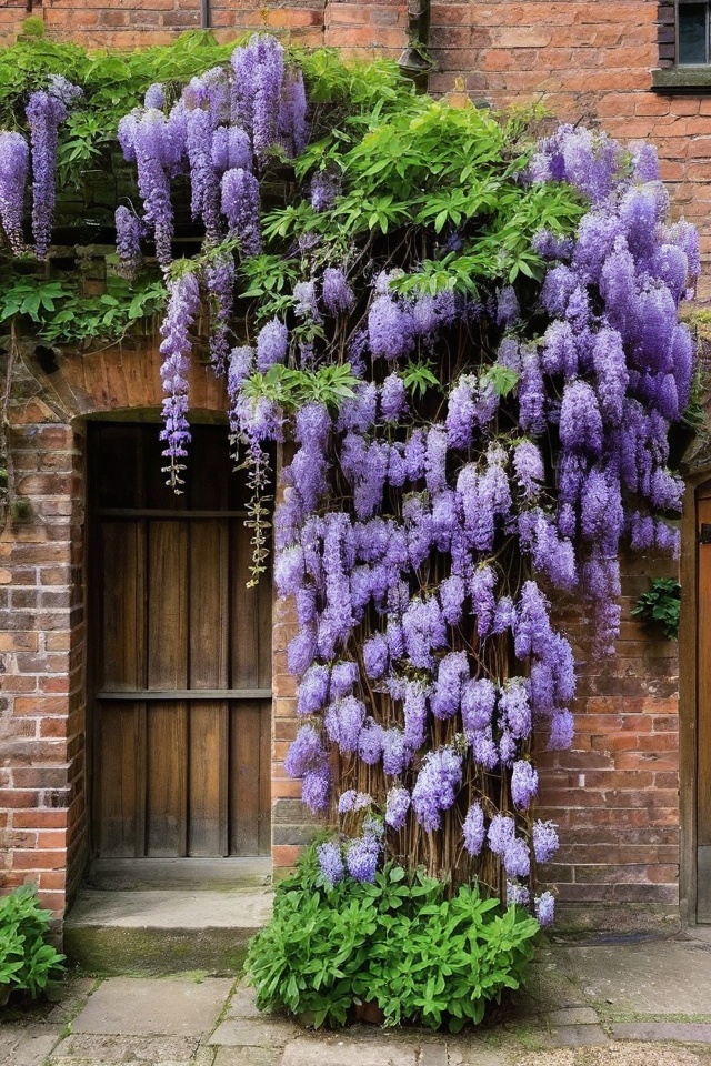 Wisteria is amazing for creating a whimsical look on your brick wall with its cascading clusters of lavender or white flowers.