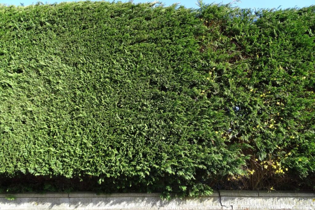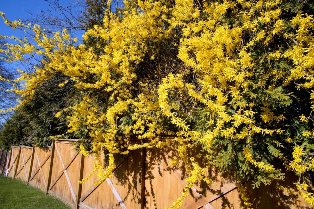 Adding forsythia to your privacy border introduces vibrant yellow flowers. Its woody stems ensure durability, while also benefiting your garden’s insect ecosystem.