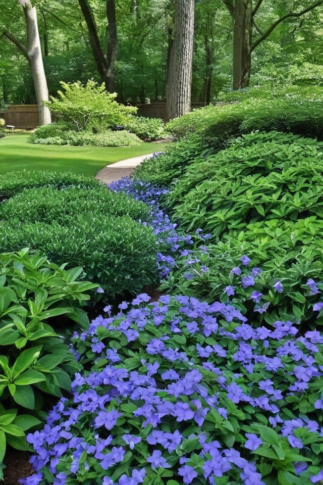 Periwinkle, also known as Vinca, spreads quickly and blooms with pretty blue flowers.
