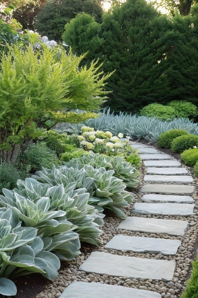 Lamb’s Ear features velvety, silver leaves that provide an interesting contrast along pathways.