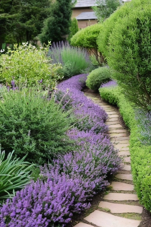 Creeping Thyme offers a lovely scent and tiny purple flowers that soften the edges of pathways.