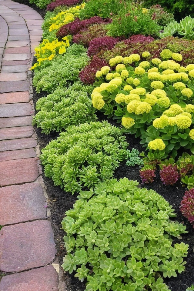 Sedum, often called stonecrop, is great for pathways because it’s durable and retains moisture well.