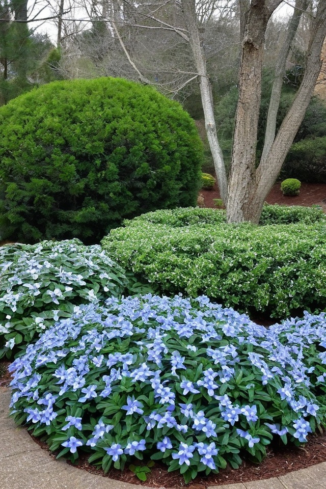 Vinca Minor, also known as periwinkle, keeps its glossy green leaves throughout the winter.
