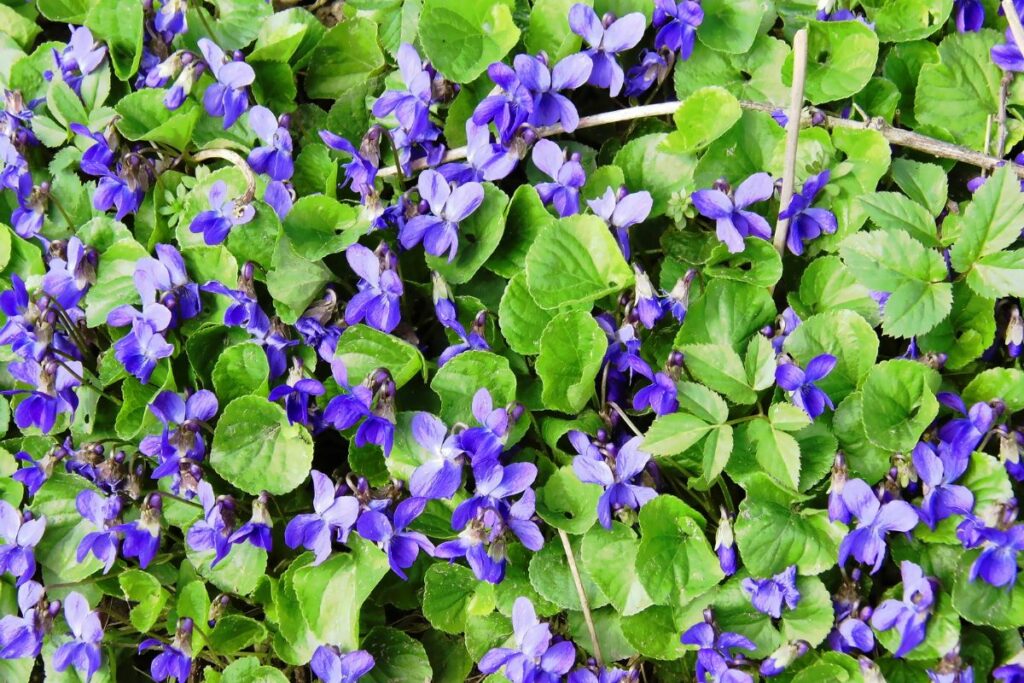 Low-growing wild violets form a dense carpet of dark green, heart-shaped leaves that spread readily in shady areas. These hardy perennials produce masses of purple, white, or yellow blooms in early spring, popping up when most other plants are still dormant.