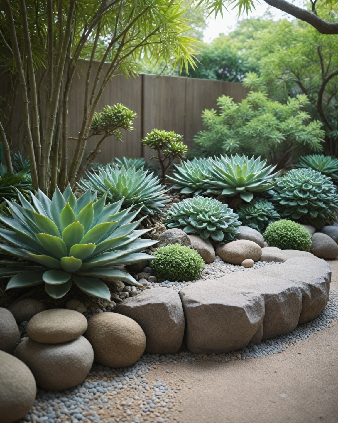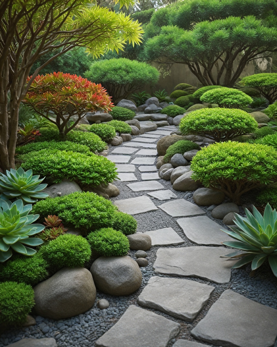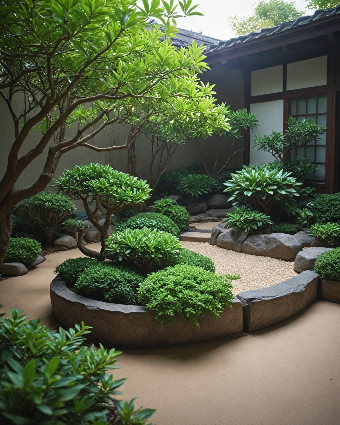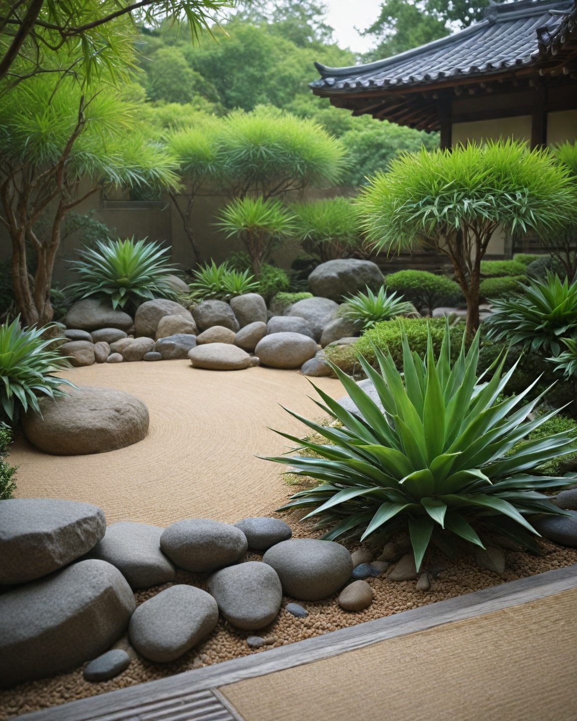 Their thick leaves give a nice contrast against traditional Japanese elements like bamboo or stone lanterns.