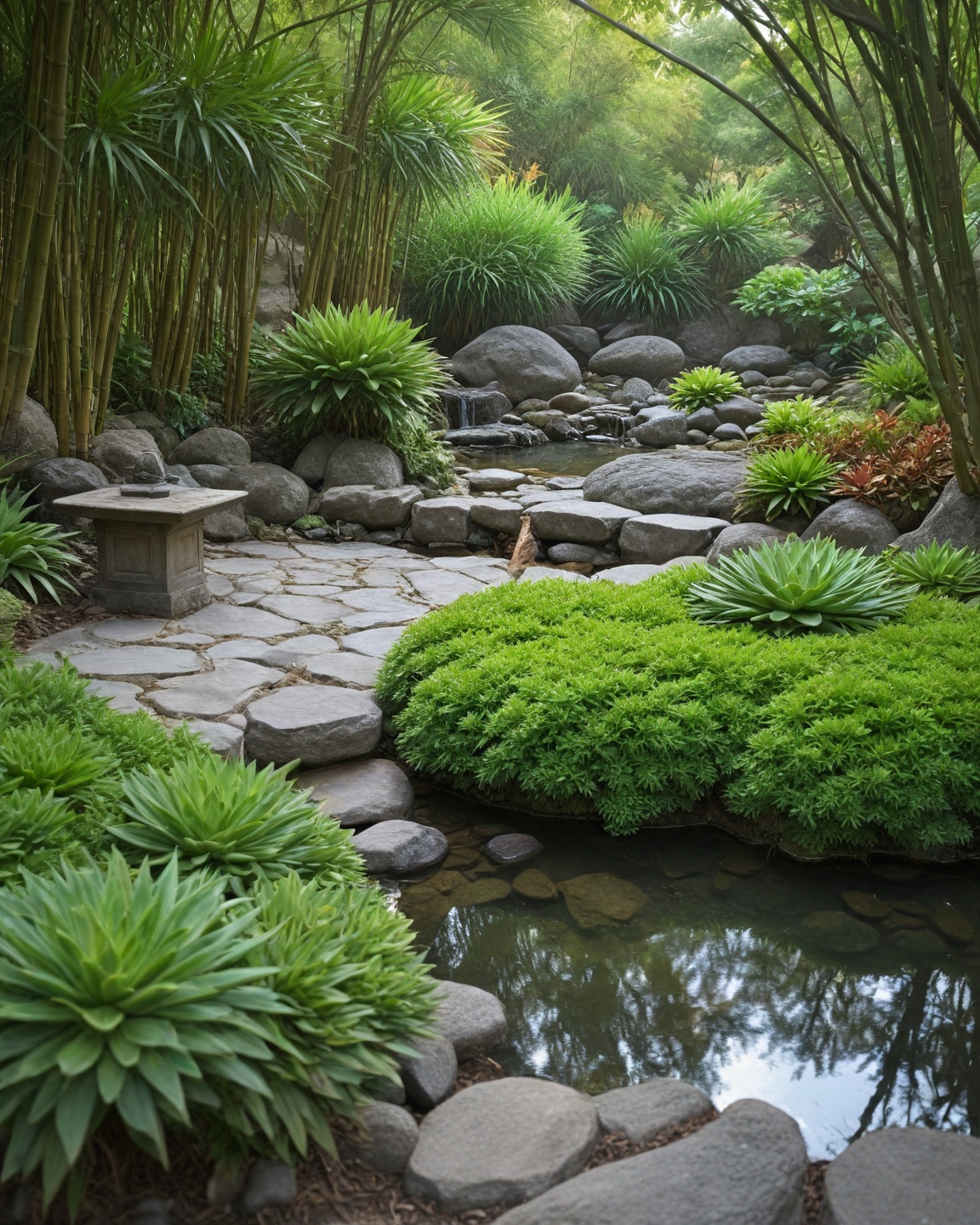 They’re super low-maintenance and come in various colors that blend well with stone and water features.