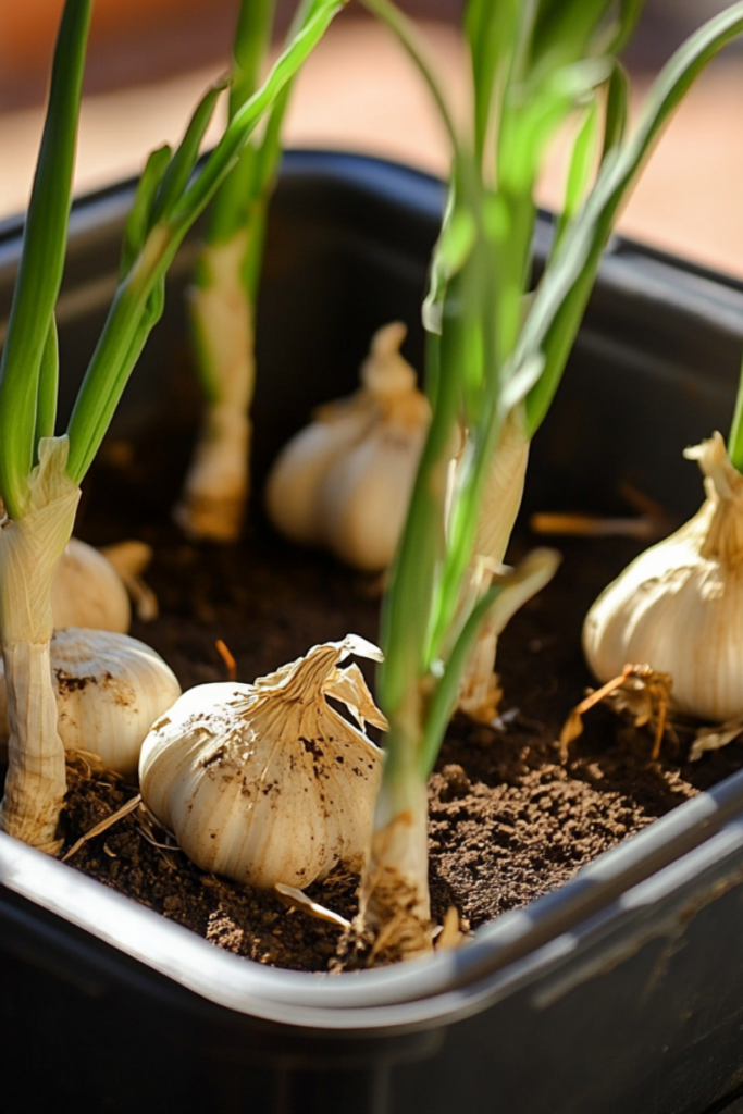 Garlic loves rich, well-draining soil. A good mix is regular potting soil combined with some compost for nutrients.