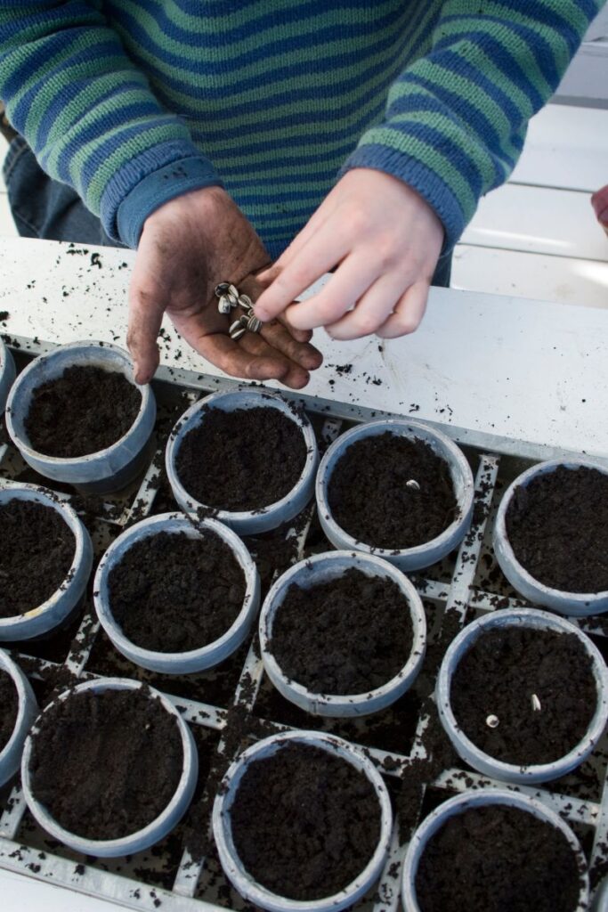 Drop one or two seeds into each hole. Cover them lightly with soil and give them a gentle pat.