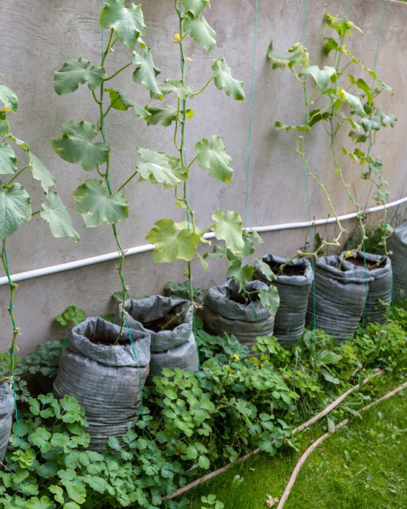 Cucumbers can climb vertically using a support system in a grow bag. They’re perfect for making refreshing summer salads and pickles.