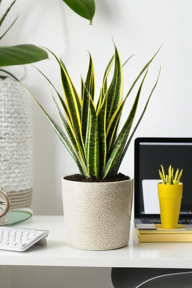 Snake plants are practically invincible and need very little light, making them the ultimate low-maintenance desk buddy.