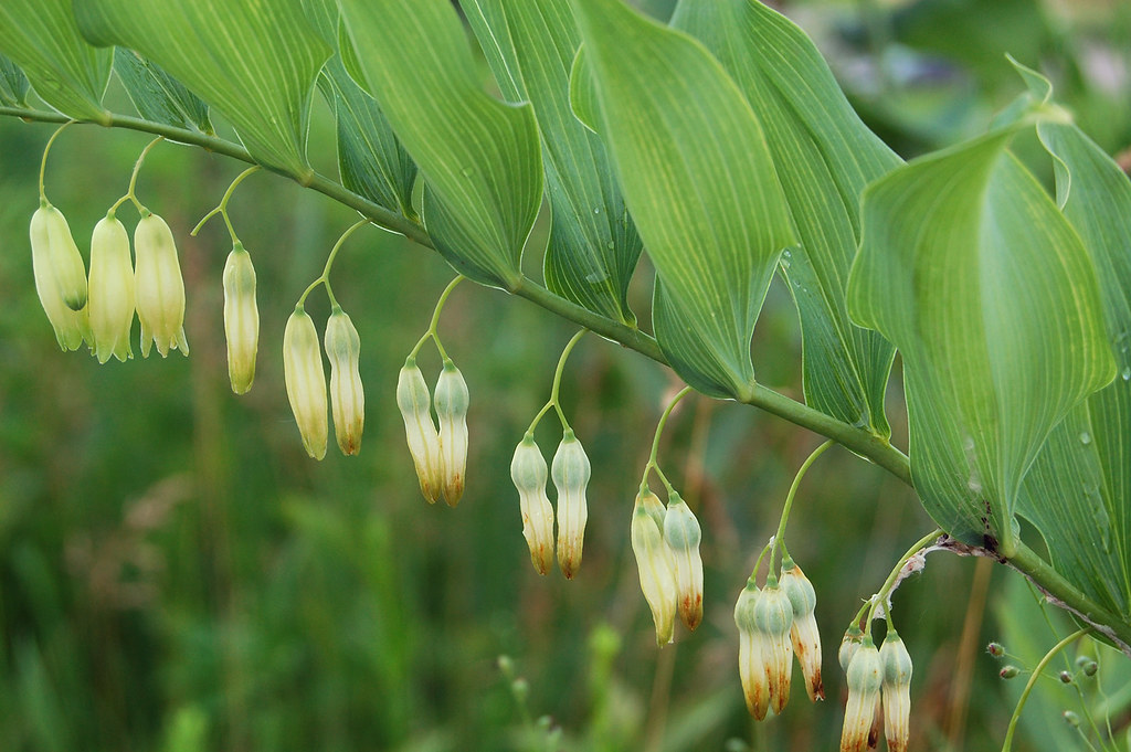 A reliable woodland plant that thrives in shady spots, Solomon’s Seal features graceful arching stems lined with oval green leaves that dance in the breeze. In late spring, small white bell-shaped flowers dangle beneath the stems like tiny lanterns, followed by blue-black berries in fall.