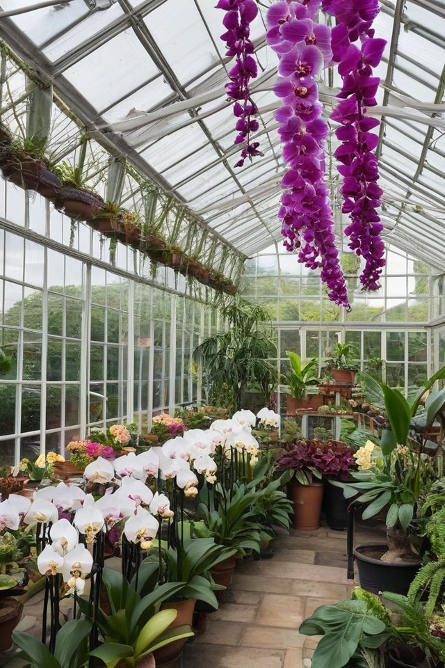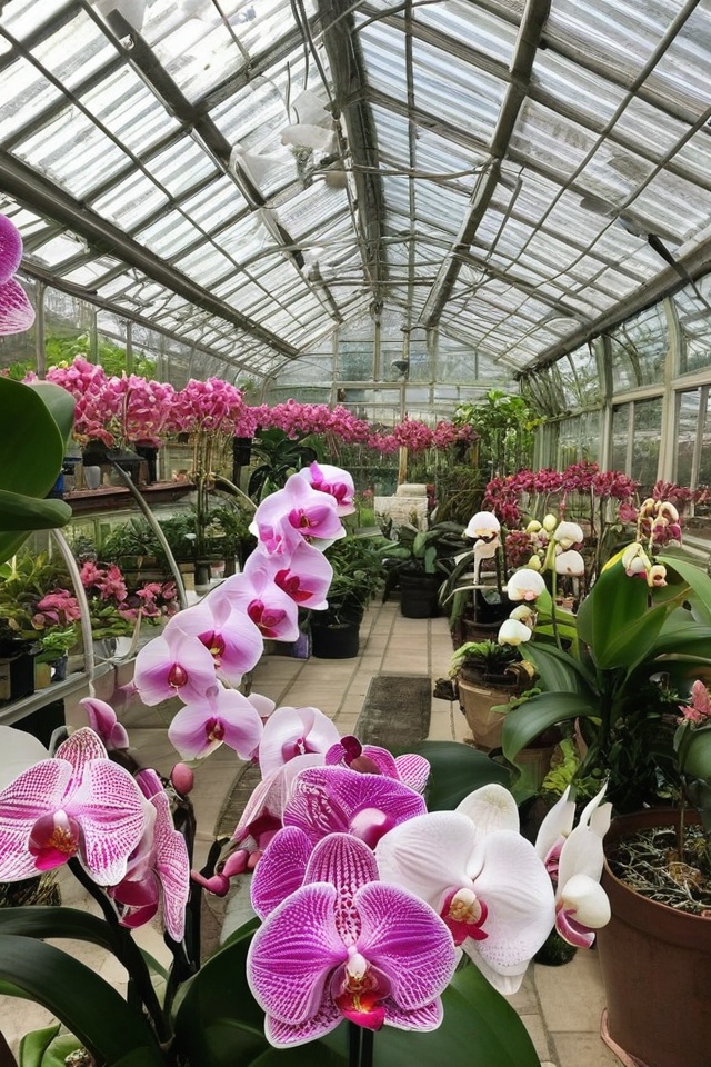 Orchids thrive in the controlled environment of an indoor greenhouse.