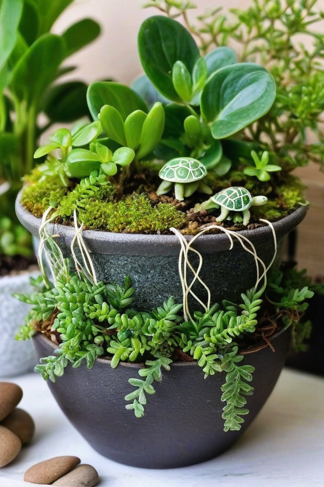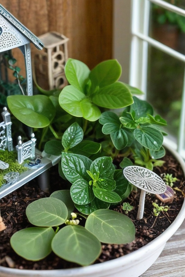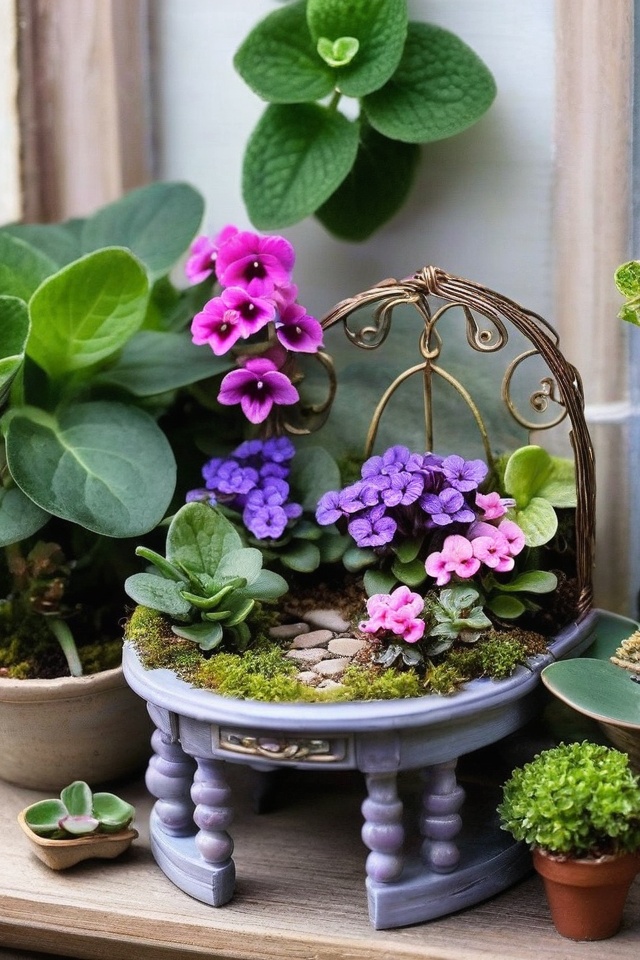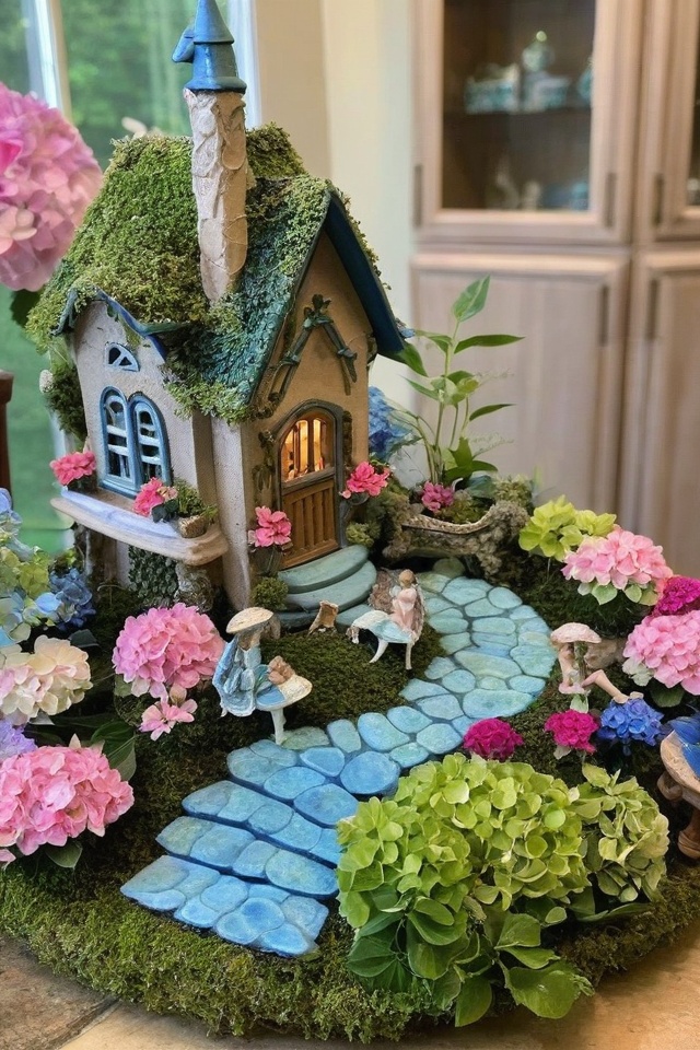 These miniature hydrangeas offer bursts of color in pinks and blues, making them a focal point in any indoor fairy landscape.