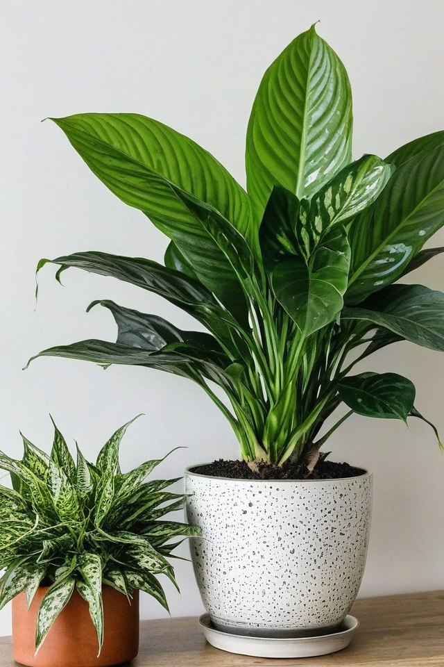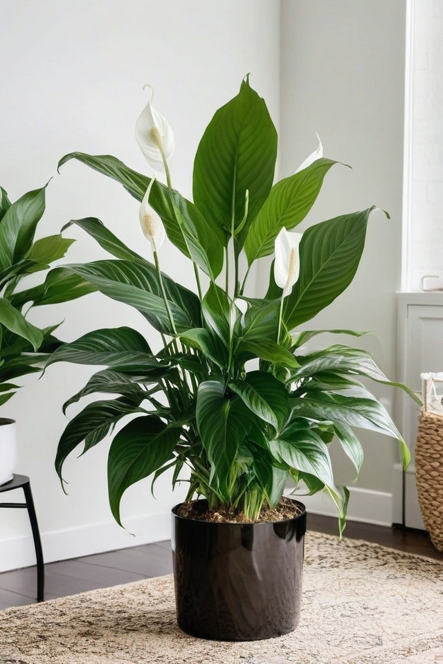 Peace lilies not only look beautiful with their white blooms but also help purify the air.