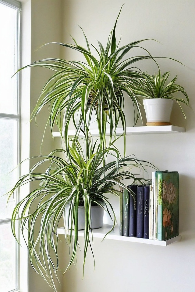Spider Plants look amazing on shelves with their arching leaves and baby “spiderettes” hanging down.