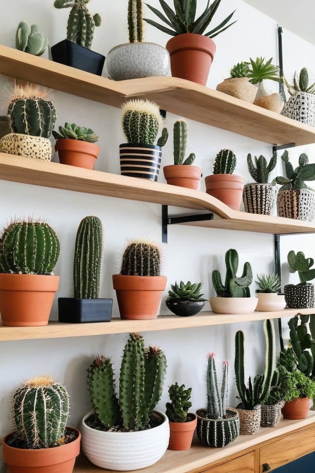 Cacti are great for high-light spots on your shelves and require barely any watering.