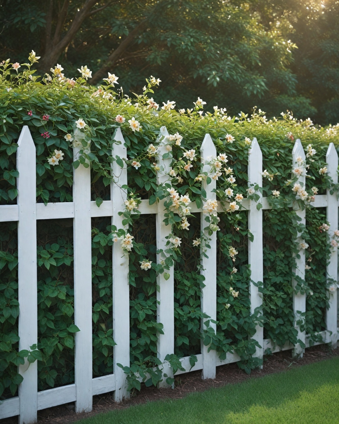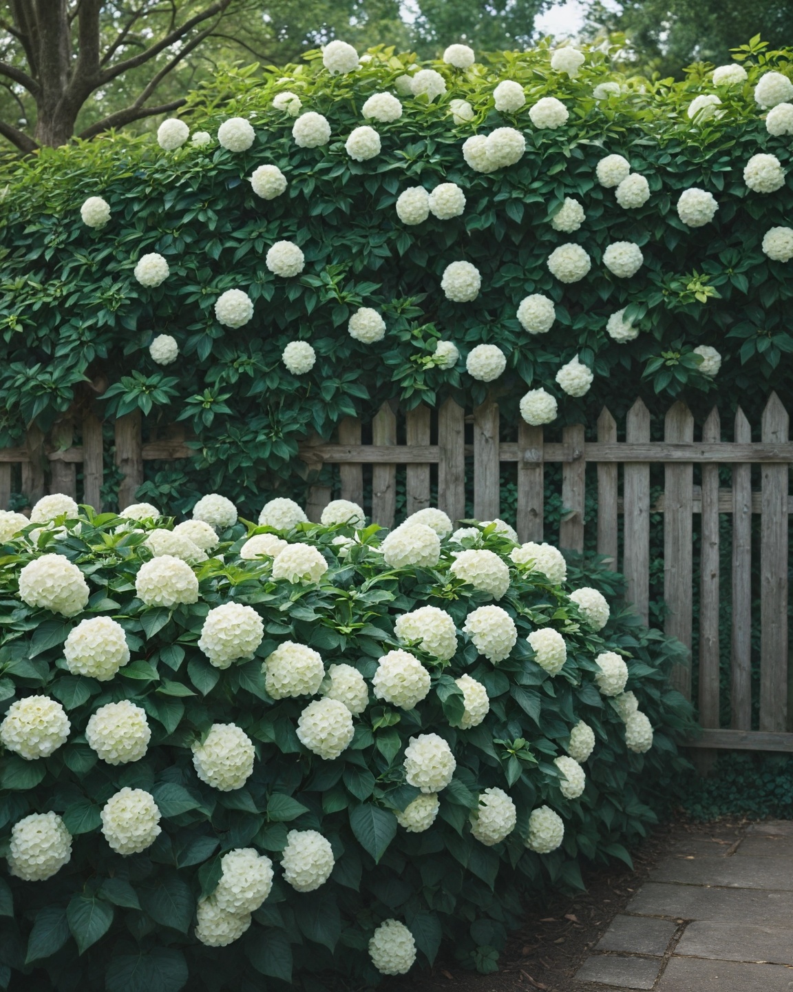 Climbing hydrangea loves shade and will give your fence a stunning, elegant look with its white flower clusters.