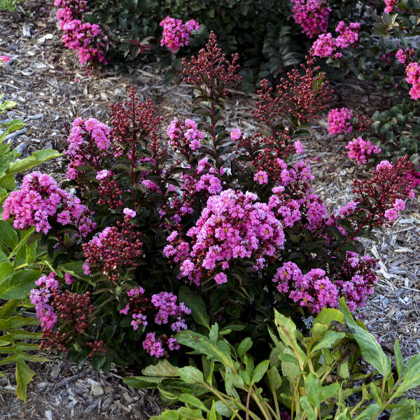 Dark-leafed crape myrtles bring drama to sunny gardens with their rich chocolate-purple foliage that deepens in color as summer progresses. This compact shrub grows 4-6 feet tall and produces clusters of deep pink flowers from midsummer through fall.