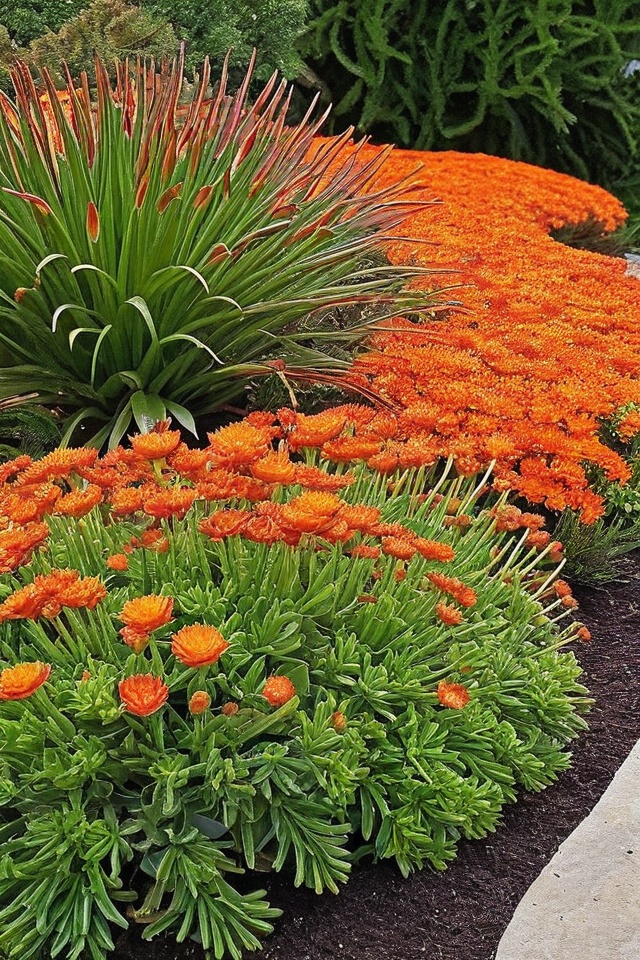The Orange Ice Plant produces dazzling, succulent flowers that cover the ground with fiery brilliance.