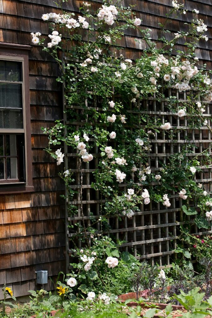 - Opt for a trellis rooftop suited to vine plants like ‘Lady of Shalott’.