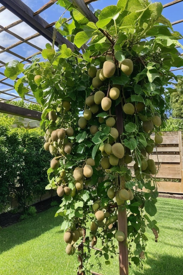 This will help them grow strong and healthy. Plus, it looks kind of cool having kiwi vines climbing around your space!