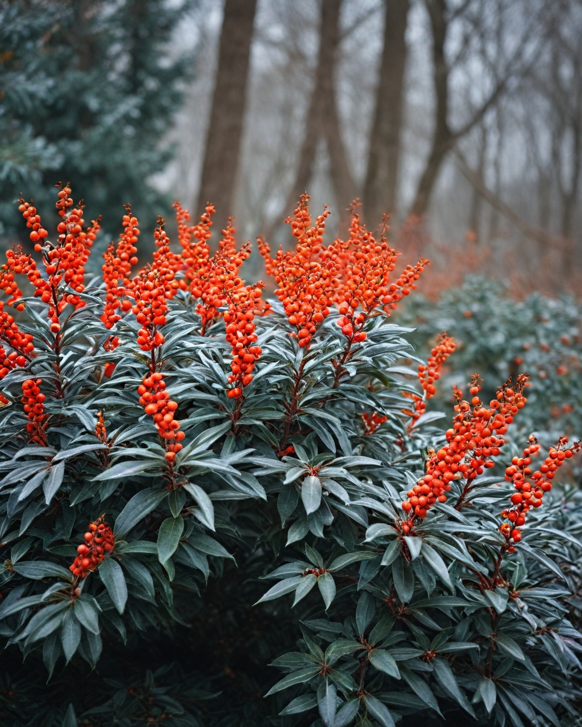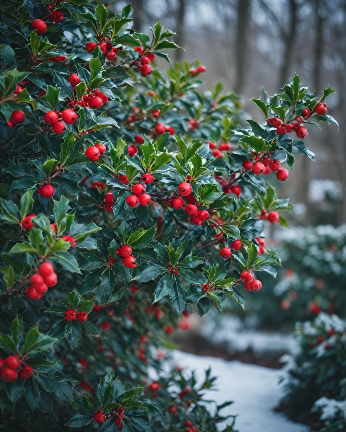Holly shrubs are perfect for cold climates and add a festive touch with their shiny leaves and red berries.