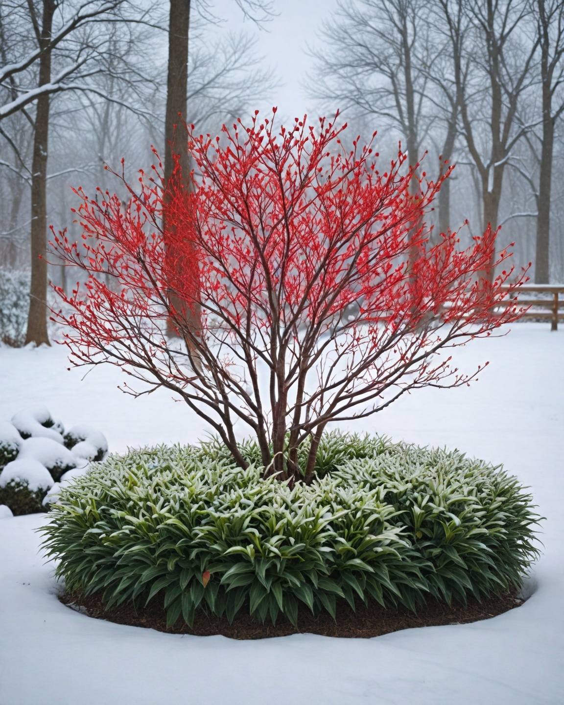 Red Twig Dogwoods are famous for their striking red branches that stand out against snowy backdrops.
