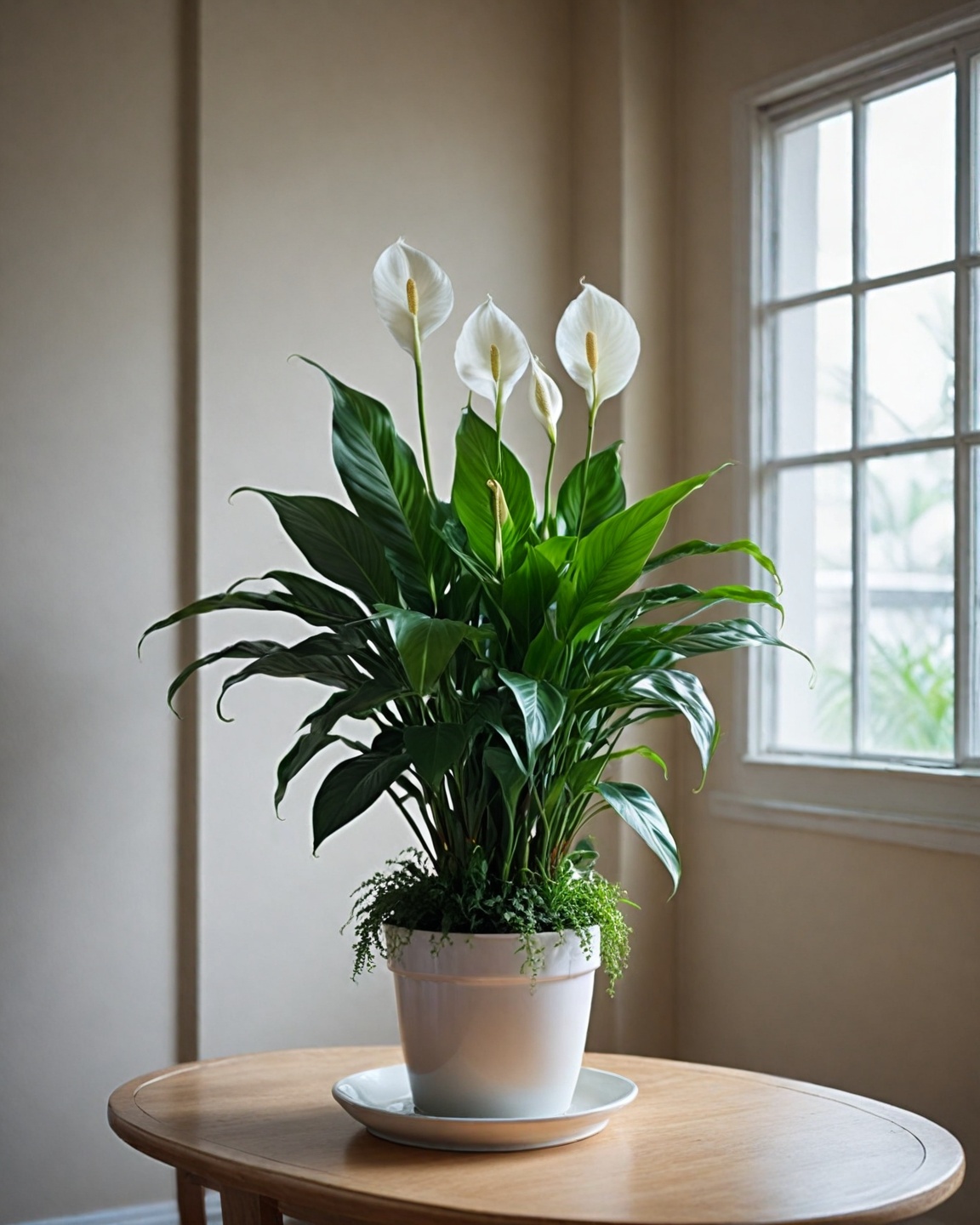 Peace Lilies thrive in low light and their lush greenery helps reduce stress levels.