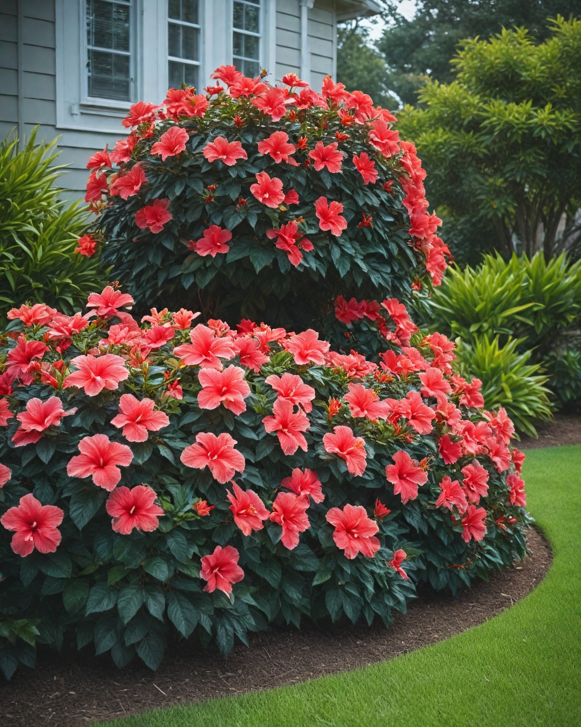 Hibiscus shrubs bring a tropical vibe to your front yard with their huge, showy blooms.