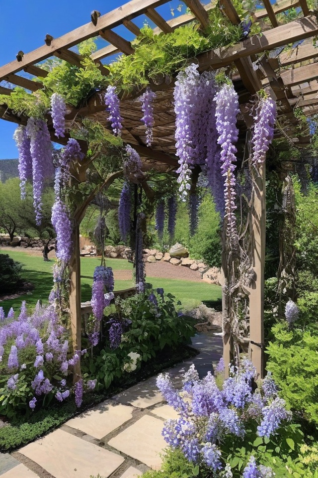 Wisteria loves the full sun and produces cascading clusters of fragrant purple flowers.