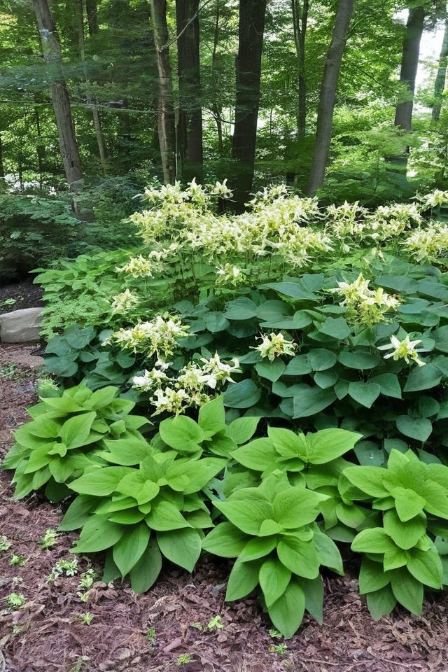 Barrenwort does well in dappled light, offering delicate heart-shaped leaves and tiny flowers.