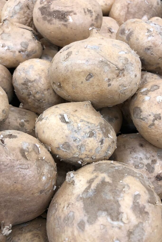 When it’s time to harvest, gently dig around the base of the plant with a garden fork to lift the tubers out of the soil. Be careful not to damage them.