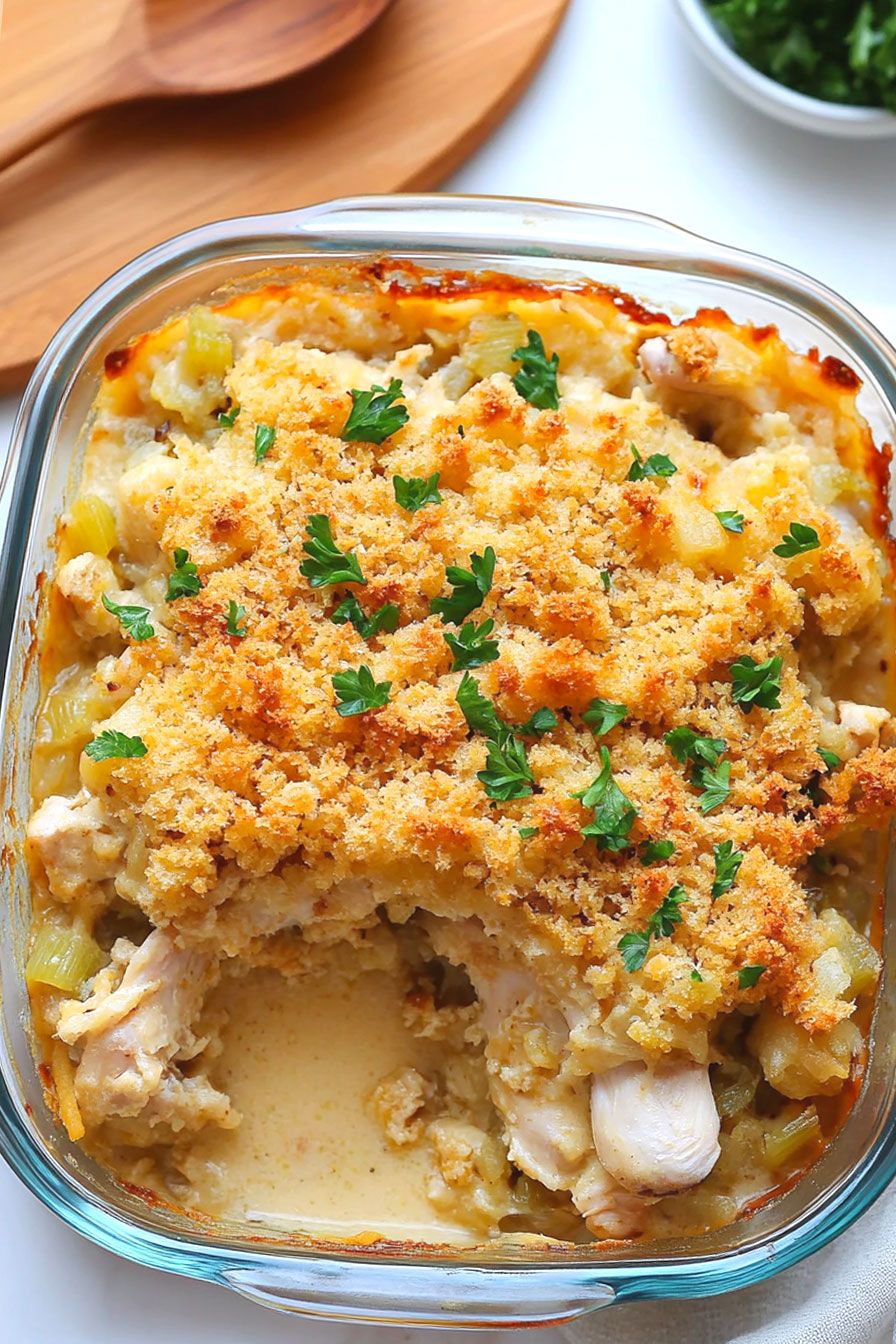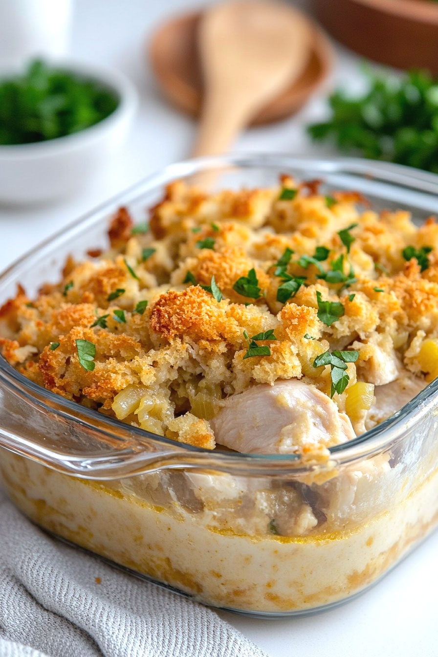 Serve the chicken casserole warm, making sure to scoop up some of the delicious gravy from the bottom of the dish and drizzle it over each serving for extra taste.