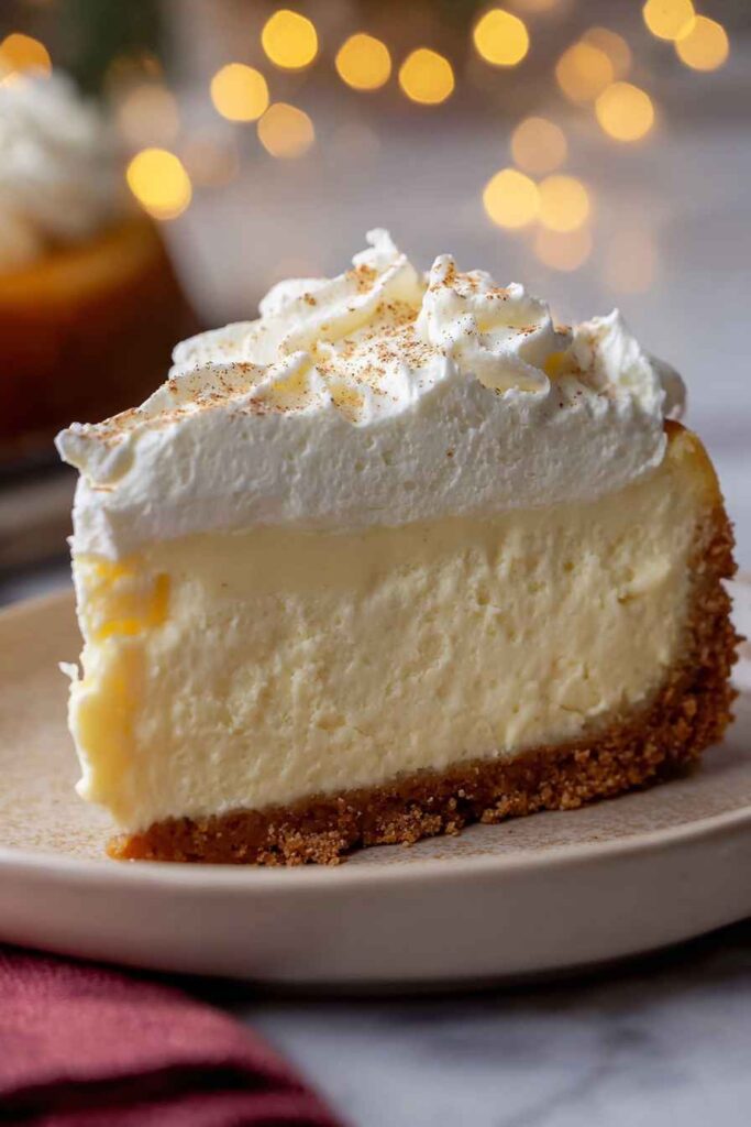 Serve chilled or at room temperature, and enjoy your creamy eggnog cheesecake!