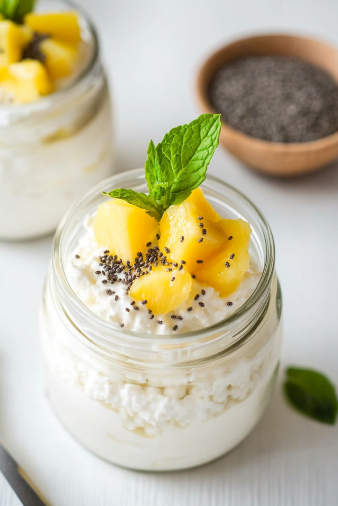 Collect all the necessary ingredients before starting: 16 oz cottage cheese, 10 oz pineapple chunks, 1 teaspoon chia seeds (optional), mint leaves for garnish, and maple syrup (optional).