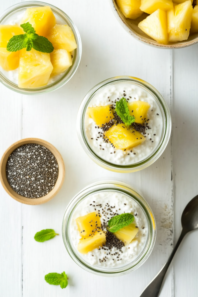 Collect all the necessary ingredients before starting: 16 oz cottage cheese, 10 oz pineapple chunks, 1 teaspoon chia seeds (optional), mint leaves for garnish, and maple syrup (optional).